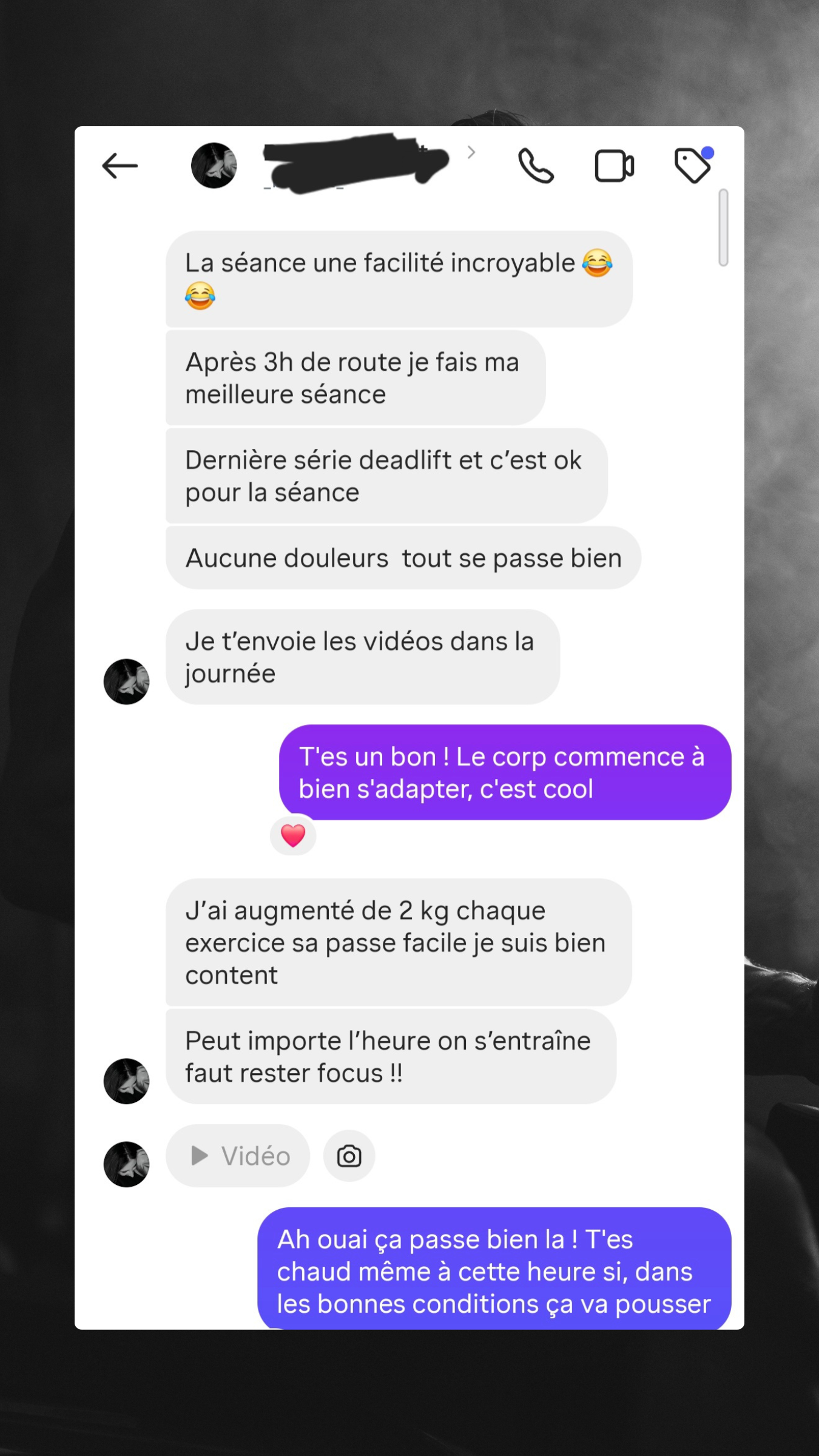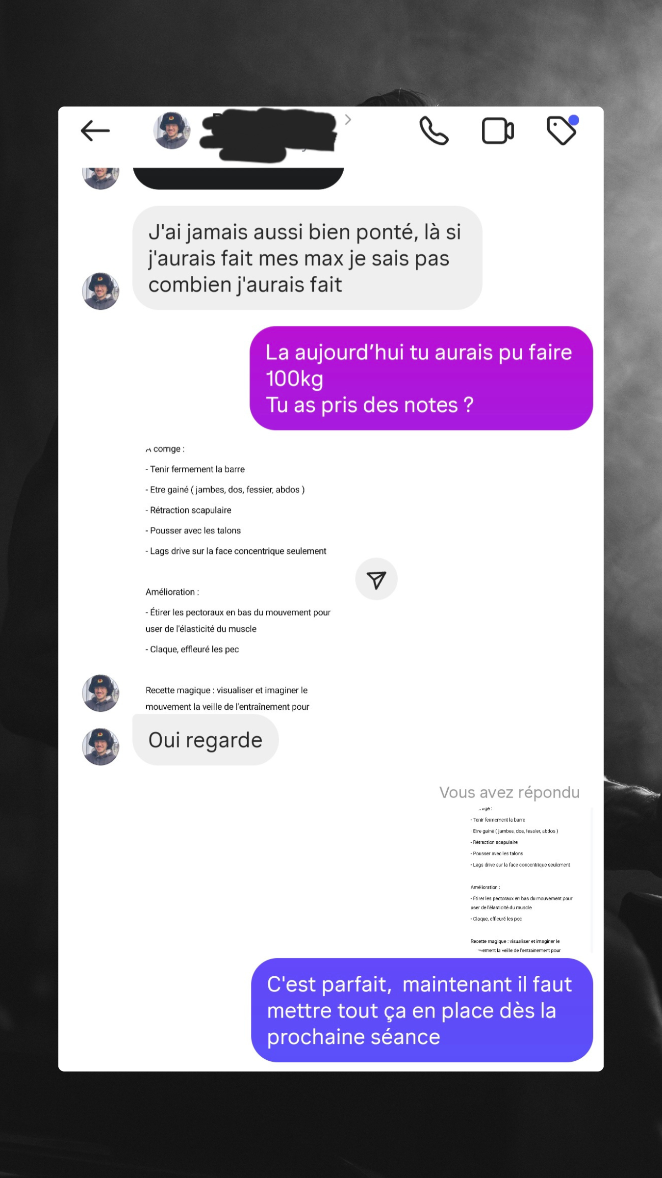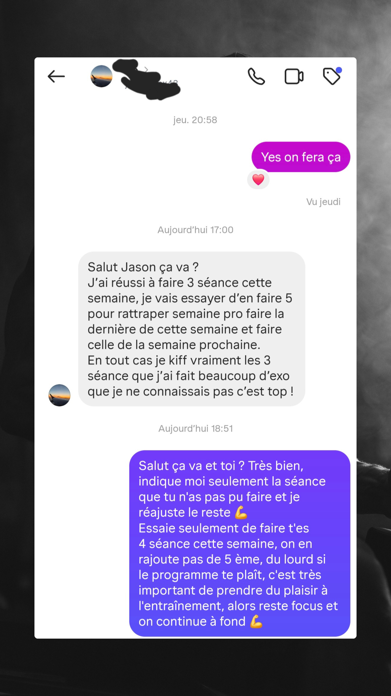 Je construis pour toi des programmes d'entraînement sur mesure, pensés pour t’accompagner semaine après semaine, sans te perdre. Tu auras chaque jour l’exercice à effectuer, la charge recommandée, une note personnalisée de ma part si besoin, ainsi qu’une photo et une vidéo pour apprendre à exécuter le mouvement correctement et éviter les blessures.