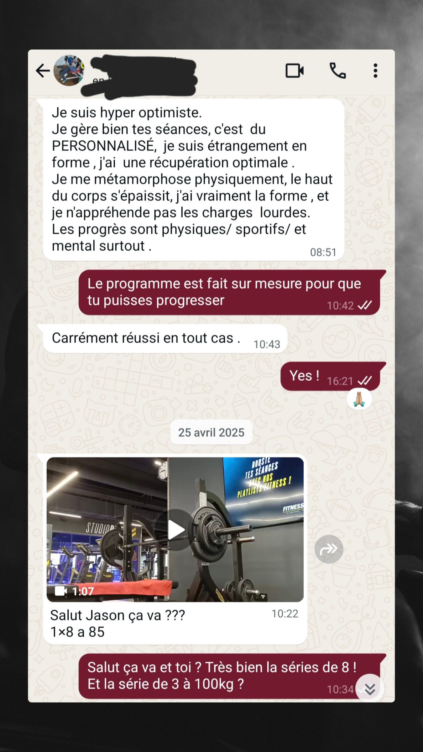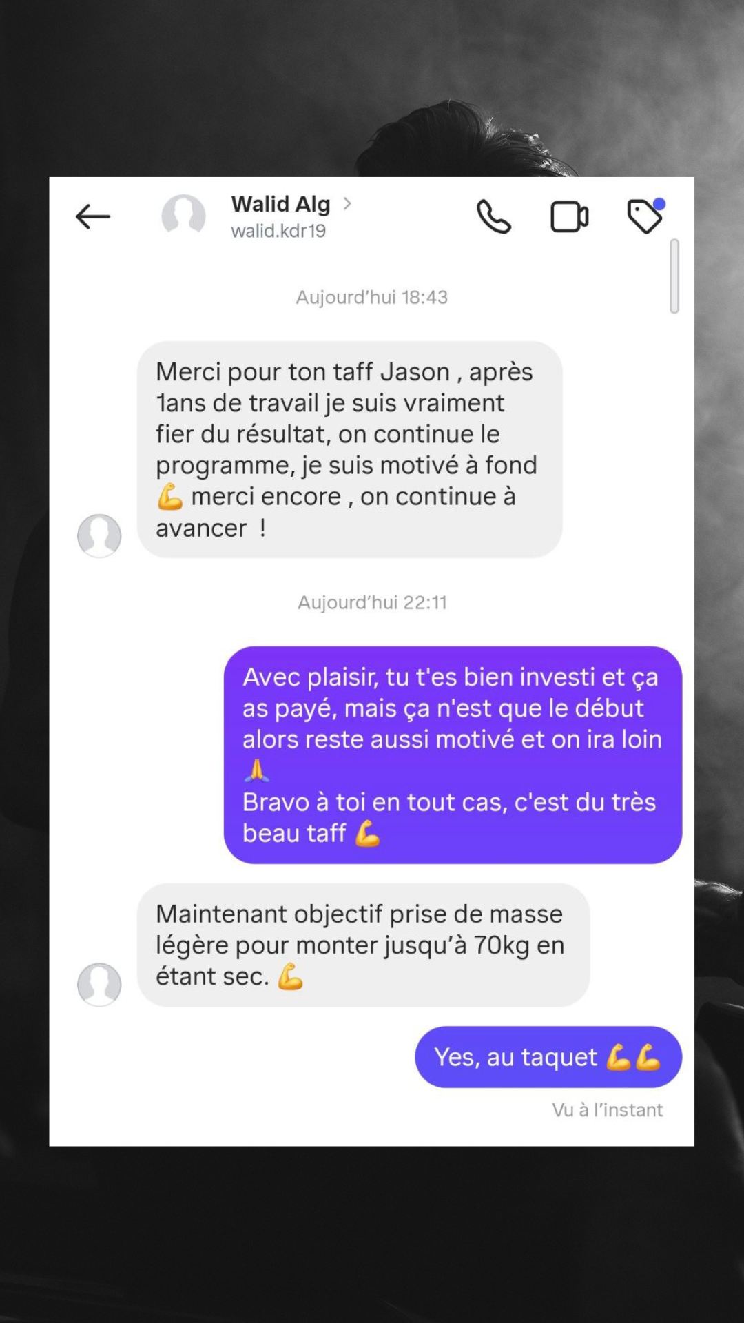 C'est là que j'ai eu la chance de tomber sur le programme de coaching de Jason dès le début, il a su cerner mes besoins, mes points faibles et mes objectifs. Son approche personnalisée a été la clé de ma progression. Non seulement il m'a aidé à perfectionner ma technique, mais il a aussi adapté mes entraînements pour maximiser mes gains musculaires tout en entraînant une progression sur chaque mouvement.